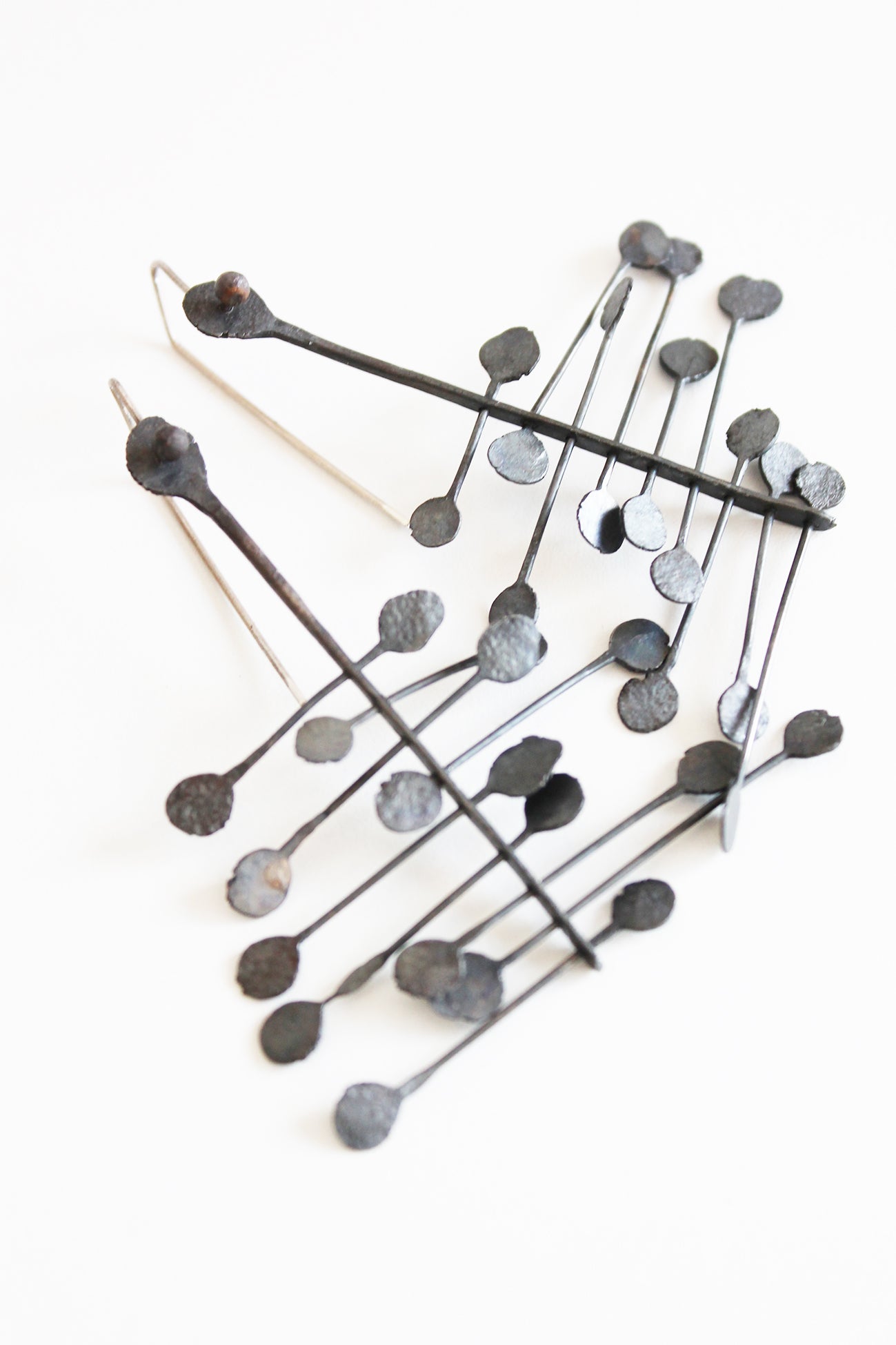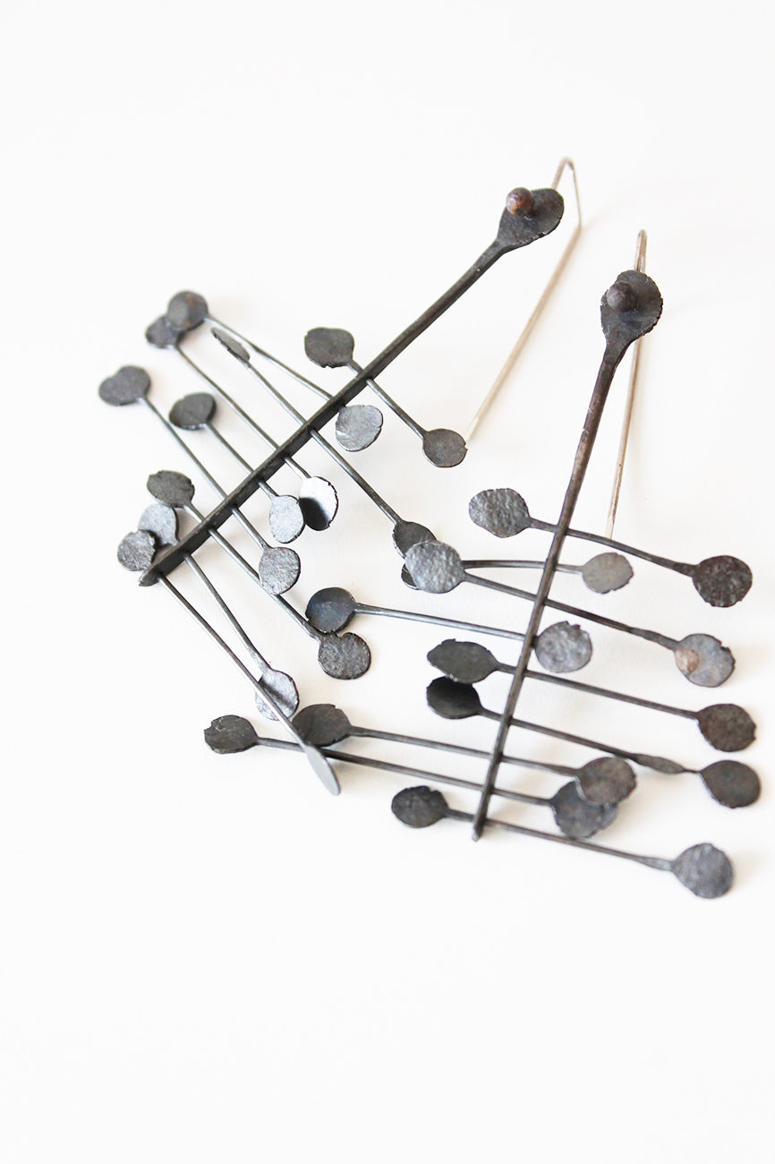 Vertical base is drilled and filled with moveable silver granulated wires which ending are flattened.