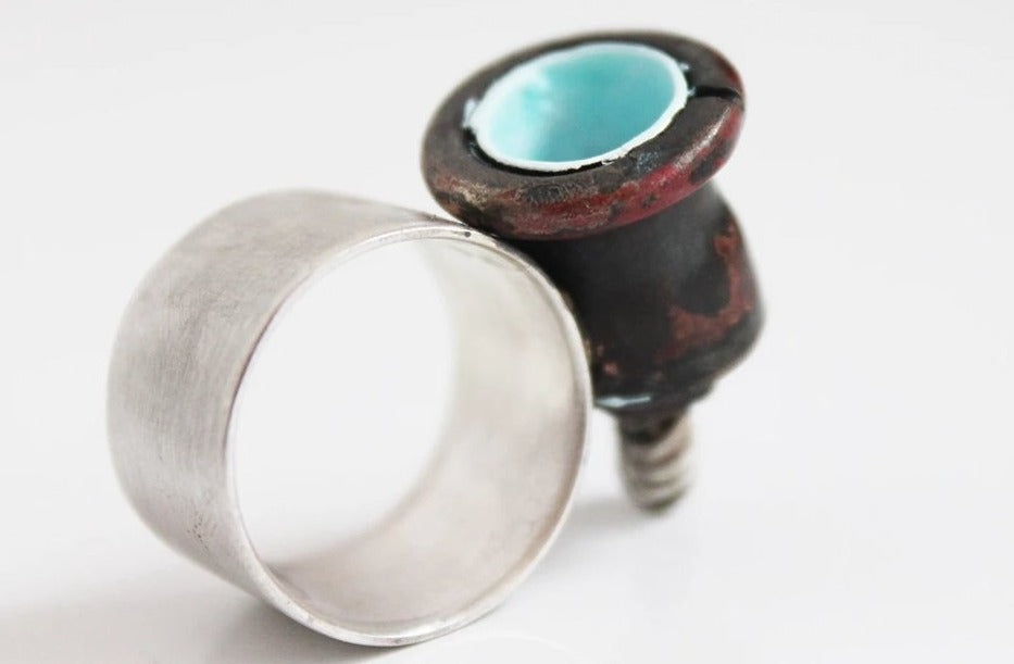 The band is made of sterling silver 1 cm height with big copper cylinder/screw decorated with metal colour so Inner space gets wonderful mixture of perfect mint green shade.