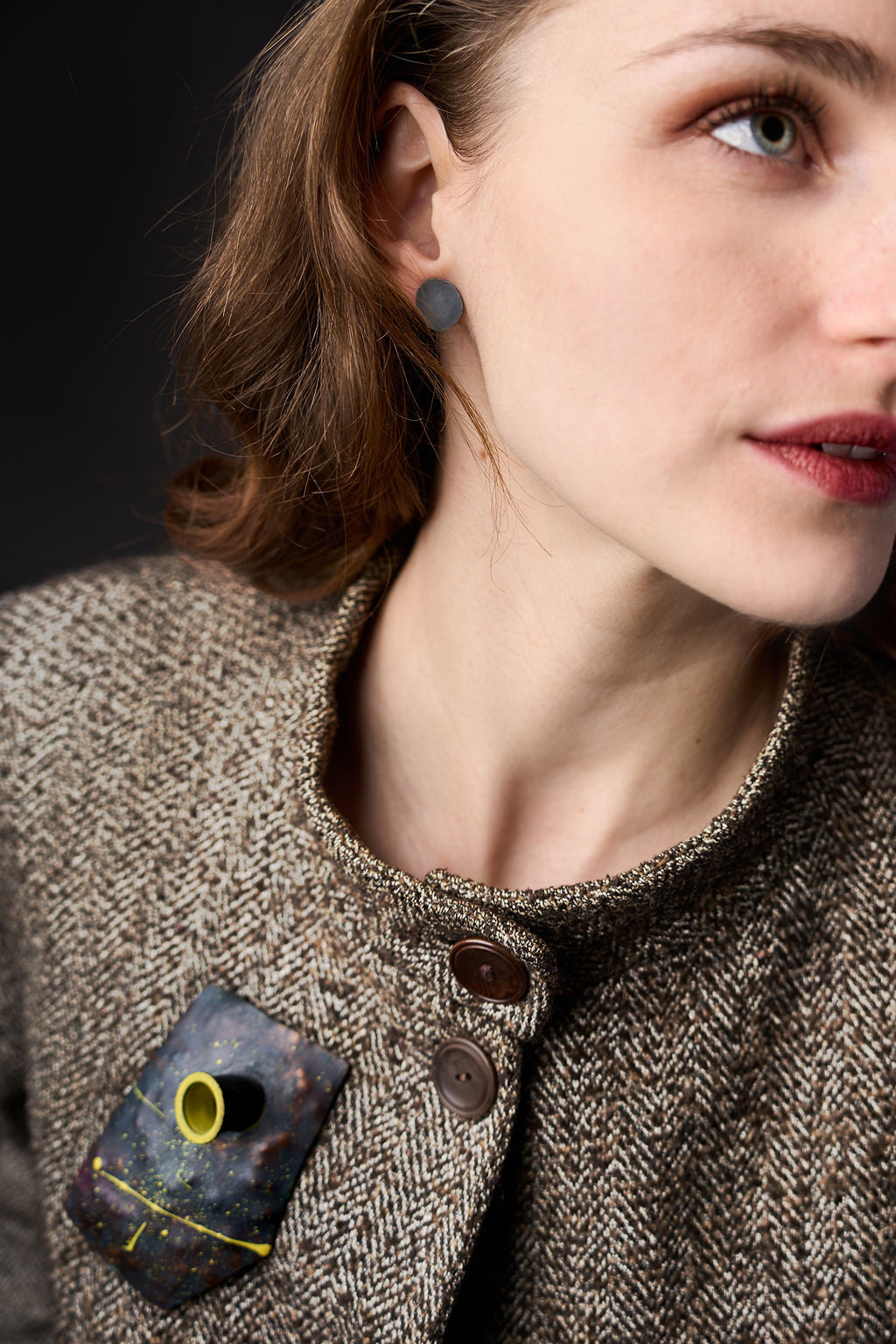 Irregular circle is sawed by hand in sterling silver and eventually patinated by hand what can result in black colour variations. Therefore each piece will develop it’s own unique character.