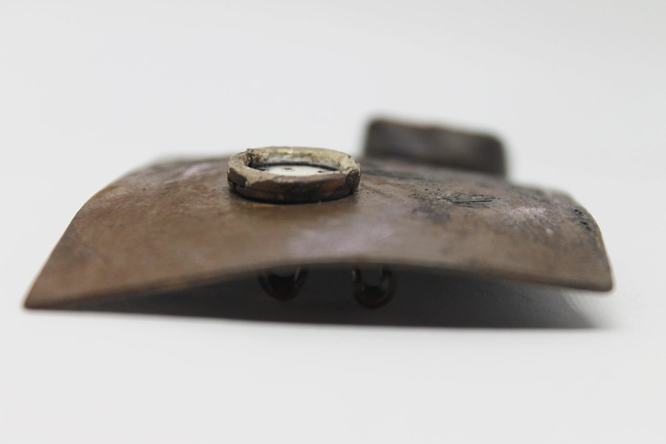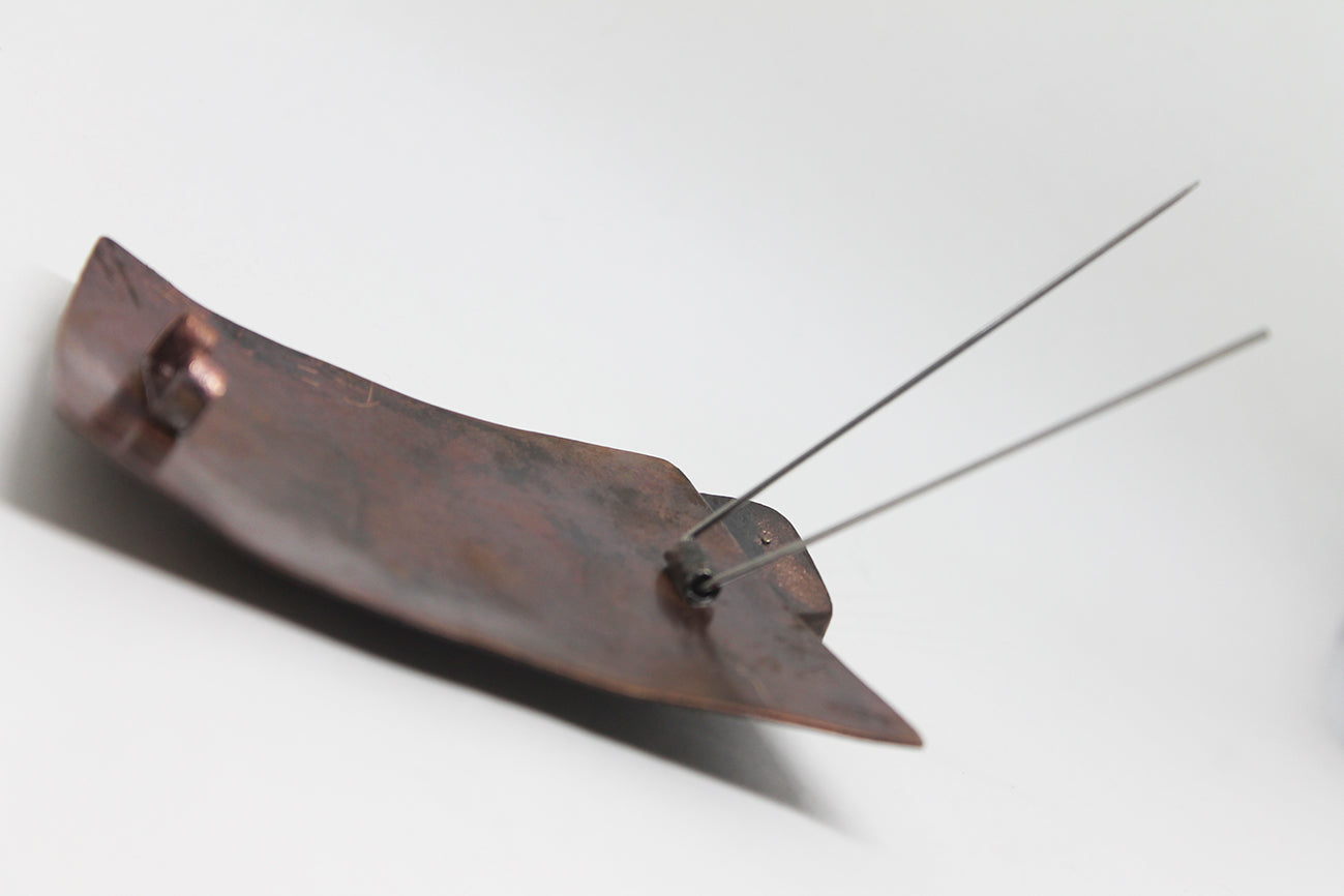 Mixed metal statement, modernist brooch is handcrafted in textured and treated copper, eventually decorated wit few antique look pink spots.