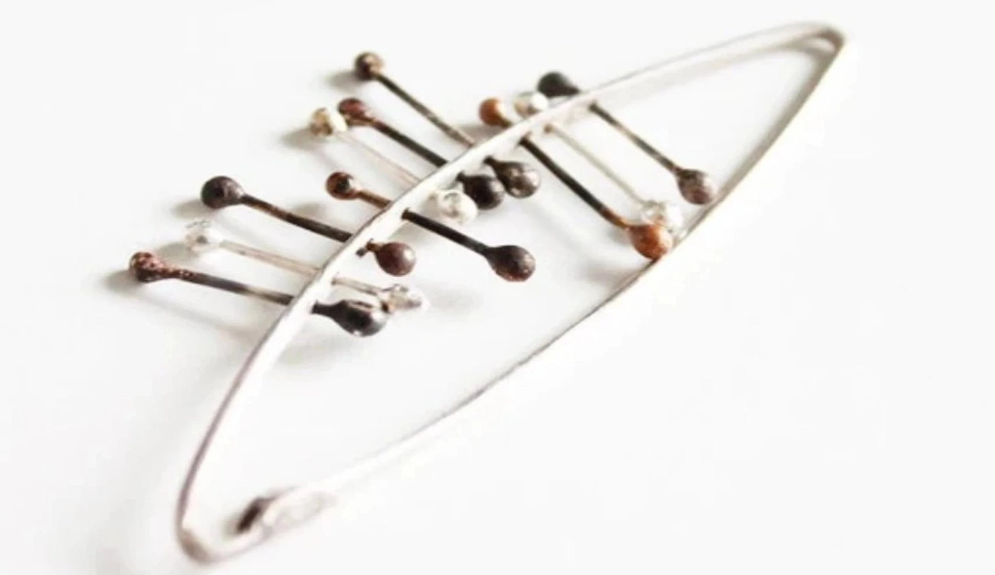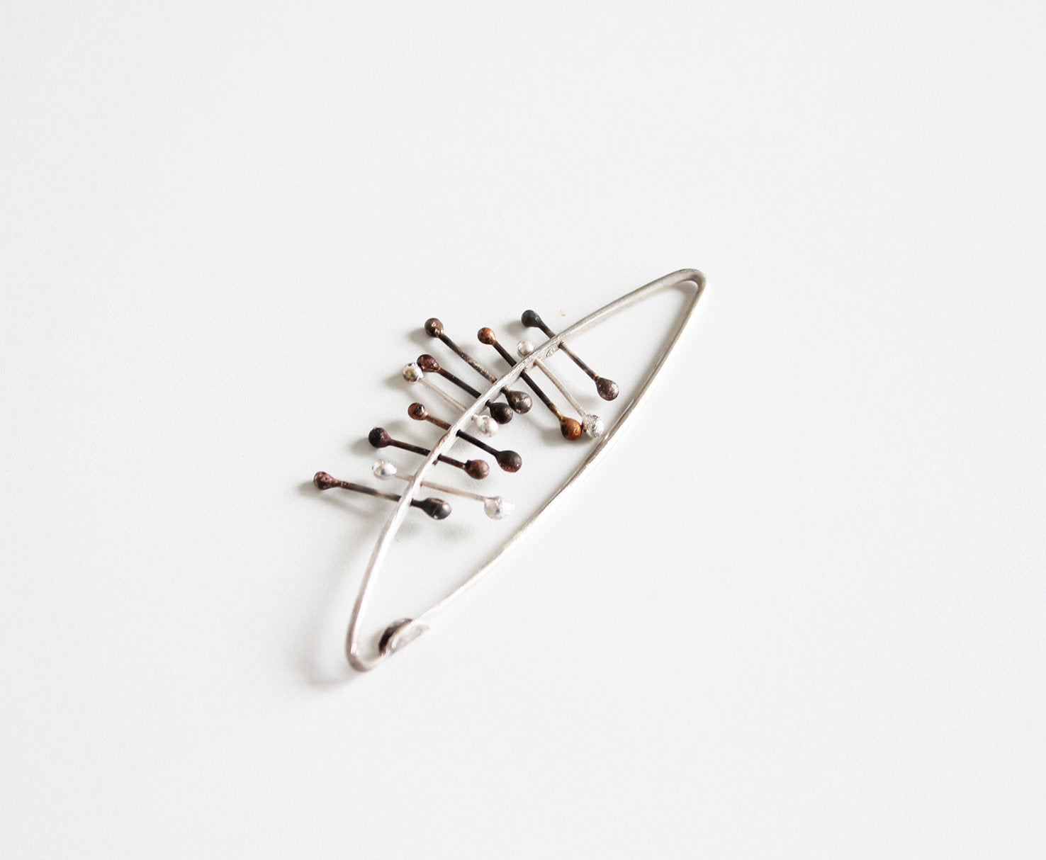 Made of mixed silver, pin is slightly curved with different silver granulated wires.