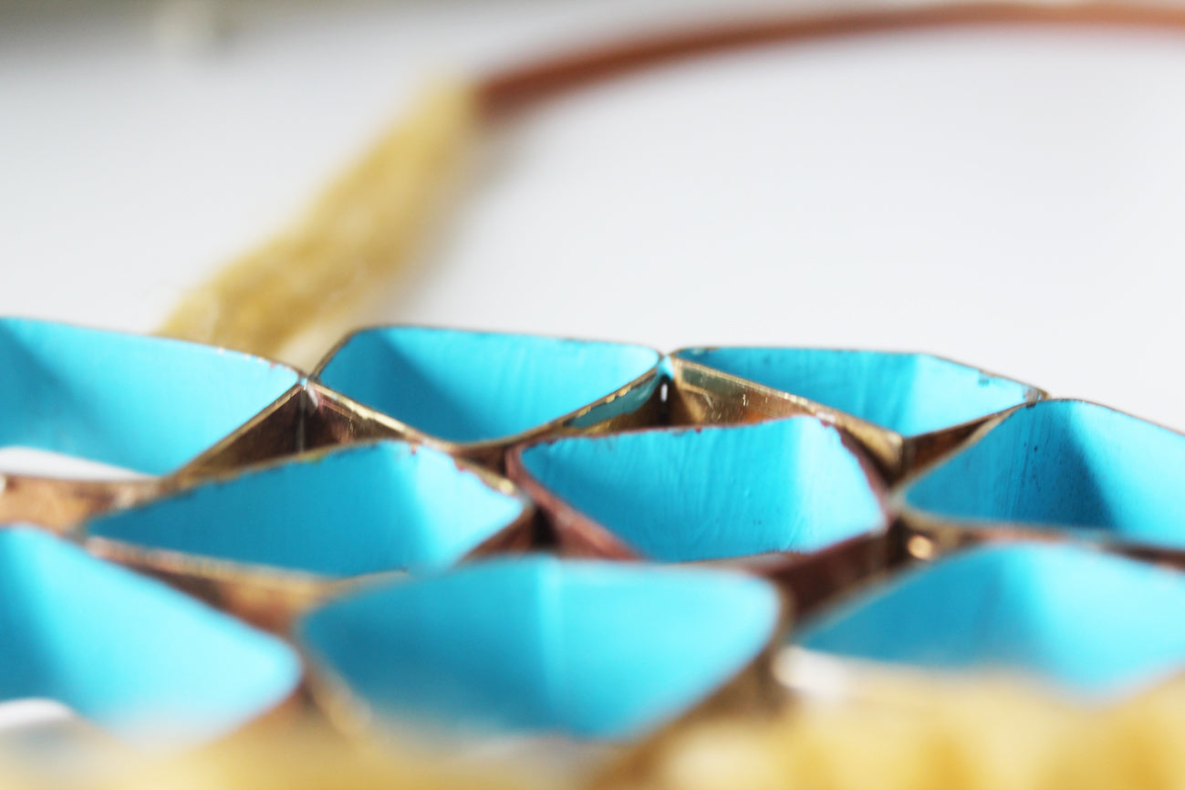 This one of a kind Artsy Necklace is made of brass structure representing sky, handmade of 10 polygons which interior is coloured in charming blue colour.