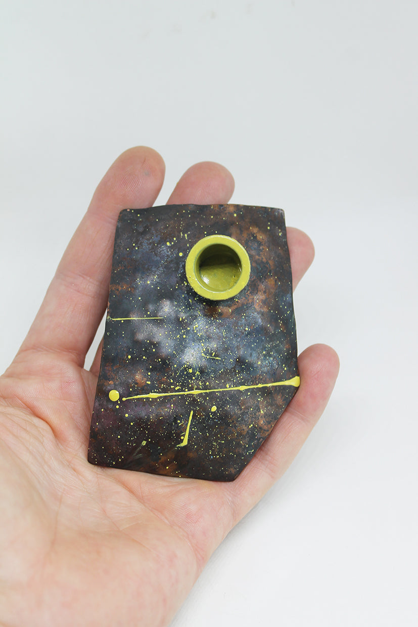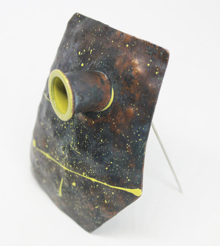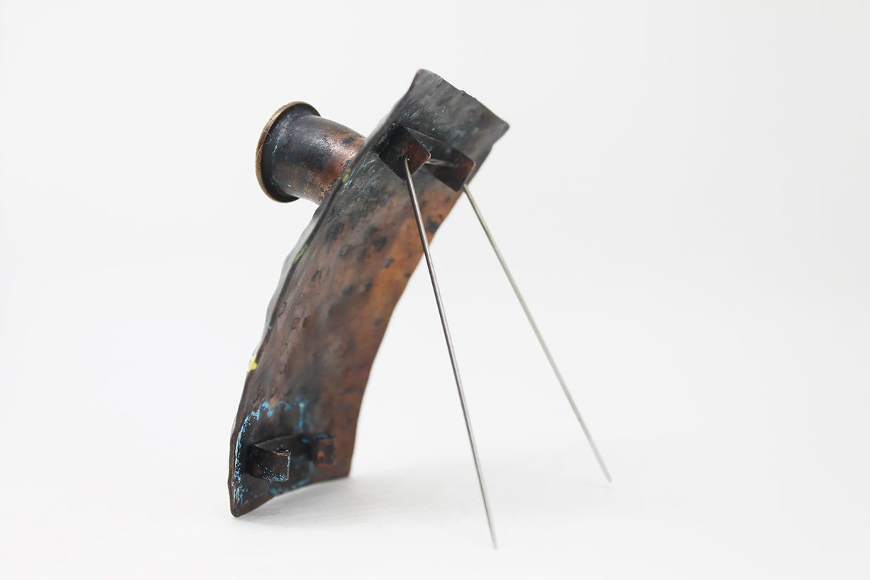 Made of copper and copper tube which are patinated / oxidized by hand and eventually decorated (splashed) with lime colour giving them vivid accents with the twist.