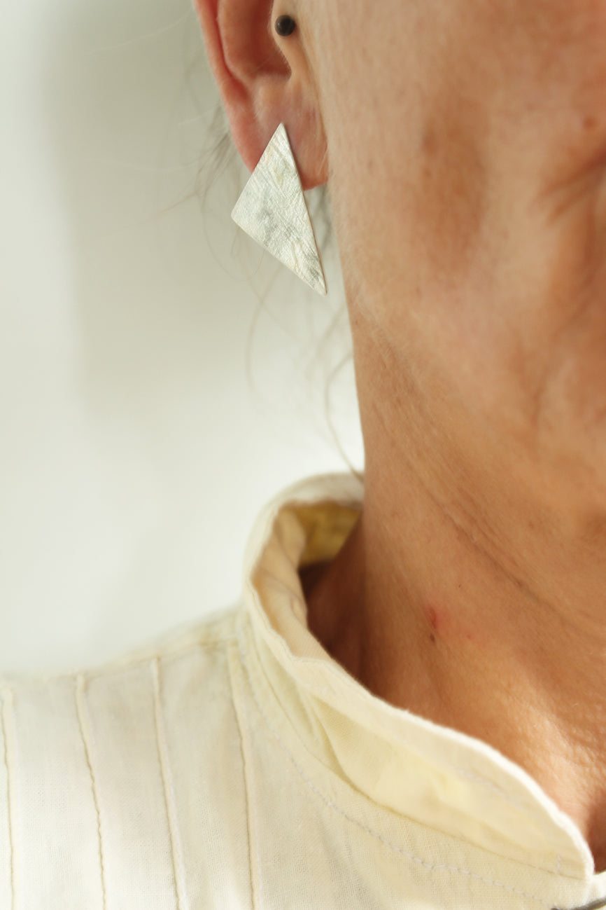 Pair of mismatched silver stud earrings as irregular unique triangles are made without repetition. Sterling silver is textured and reticulated by hand giving them rustic, antique and charming look fitting everyday activities and more.